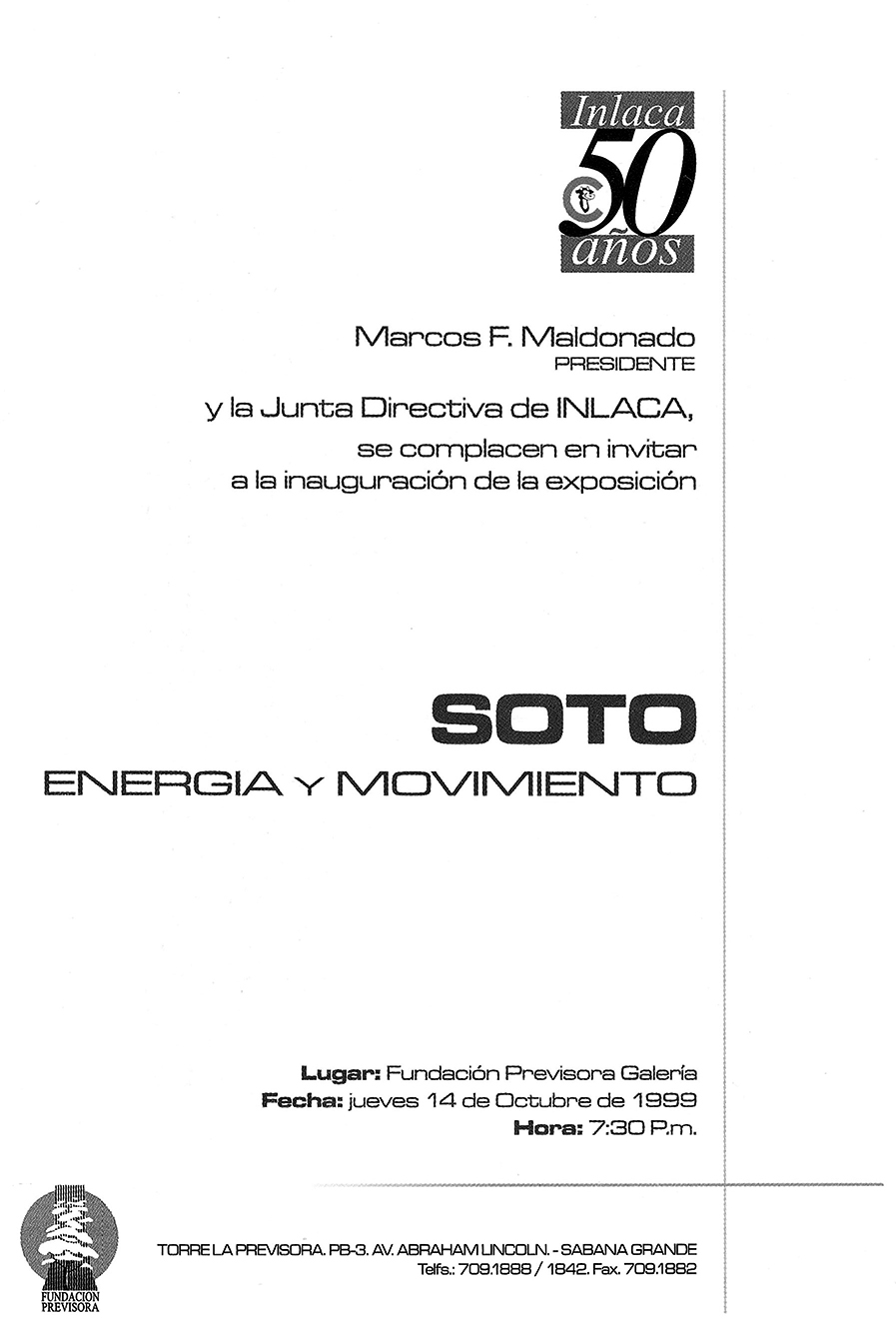 AHFM N° 5475: Invitación del Dr. Marcos Maldonado (Presidente de INLACA) y de la Junta Directiva a la exposición “Soto Energía y Movimiento” en conmemoración de los 50 años de INLACA. Lugar: Fundación Previsora Galería. Hora: 7:30 pm. 3 págs. Caracas 14-10-1999. 3 págs.