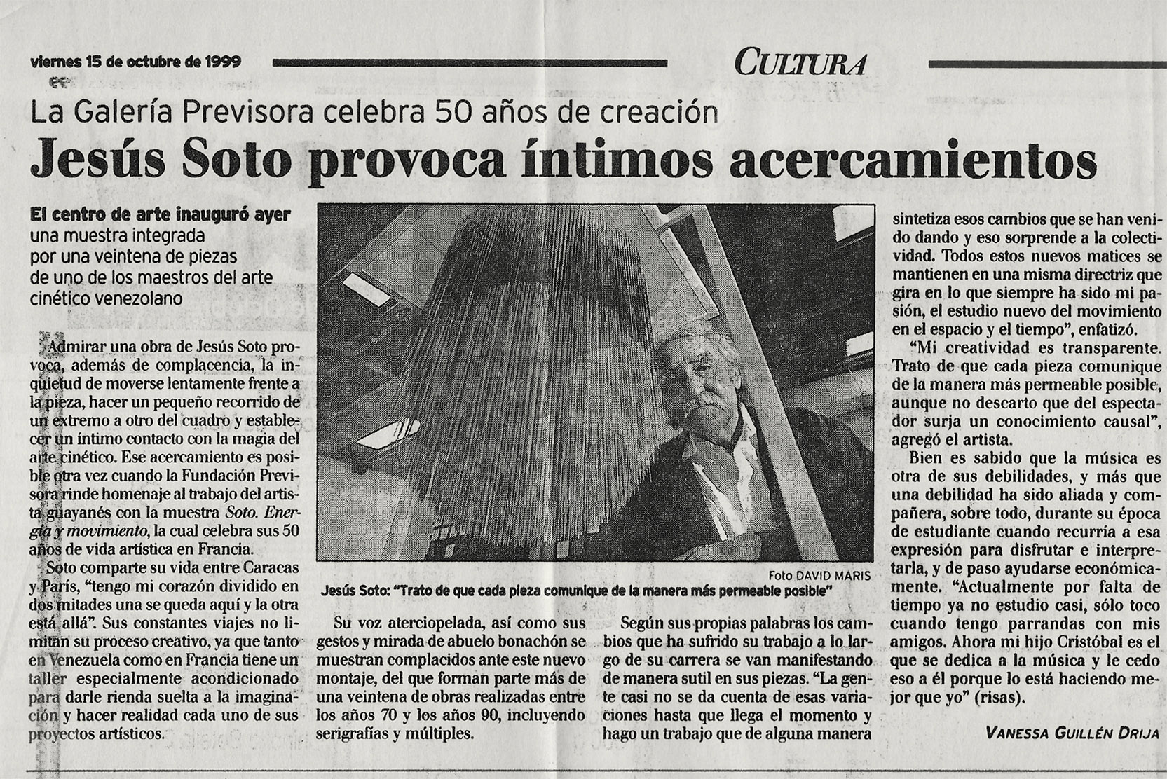 AHFM N° 5525: GUILLEN DRIJA, Vanessa, “Jesús Soto provoca íntimos acercamientos”. El Nacional. Caracas, 15-10-1999. P. C-11 – Cultura. 2 págs.